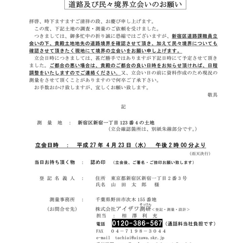皆様のご予定を伺って、関係者一同が揃って立会を行うことは非常に困難であるため、立会日時の設定は、お知らせの日から、おおよそ1週間から2週間を目安に日時を設定をさせて頂いております。当日ご都合が悪い方については、個別で対応させて頂いておりますので、何卒、ご協力をお願いいたします。