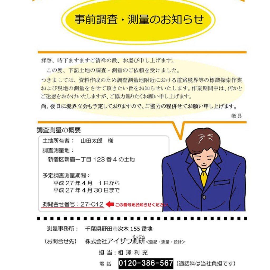 通常、土地家屋調査士は隣接所有者の方々へ 立会い並びに事前測量承諾のための挨拶回りを行います。無断で敷地に入る事は御座いません。